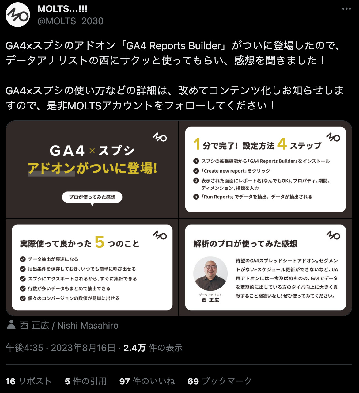 言うてMOLTS…!!! のフォロワー数は200ちょっと。それでも2.4万imp。