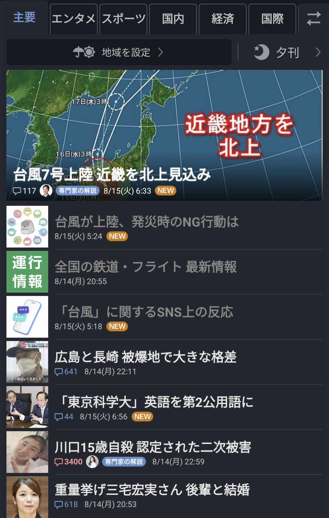 8月15日のヤフトピ。一番上は媒体だけど、2番目以降「Yahoo!天気防災」「Yahoo!路線情報」「Yahoo!リアルタイム検索」。もとよりテキストニュースだけのアグリゲーターと宣言しているわけではない。ここにYahoo!ニュース個人がさらに猛威を振るうし、なんだったらまとめもやり出す。